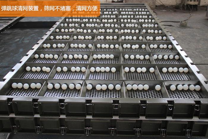 2、裝有彈跳球清網裝置,此清網形式系統通過布設在篩網下、托球板上面的高性能彈跳球不規則的擊打篩網,靠二次諧振完成清網防堵,其內部結構如圖4所示。此結構簡單易行、效果顯著,適用于大多數篩分作業的清網和防堵。